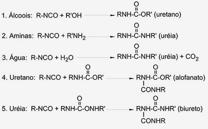 Como resultado, na tecnologia dos PUs existem cinco reações principais dos isocianatos com: